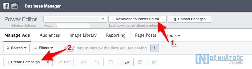 Nếu bạn vẫn chưa quen dùng Power Editor thì bạn nên tìm đọc tài liệu hướng dẫn trước. Sau khi đã đăng nhập vào Power Editor rồi, bấm chọn “Download to Power Editor”, chọn tài khoản quảng cáo bạn định dùng và bấm “Download”.