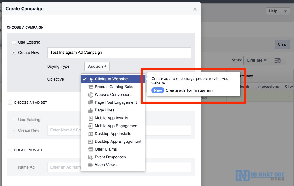 Tiếp tục, bấm “Create Campaign”, điền tên chiến dịch vào và chọn “Clicks to Website” trong mục Objective. Bạn sẽ thấy một cửa sổ hiện ra với thông báo: “New: Create ads for Instagram”.