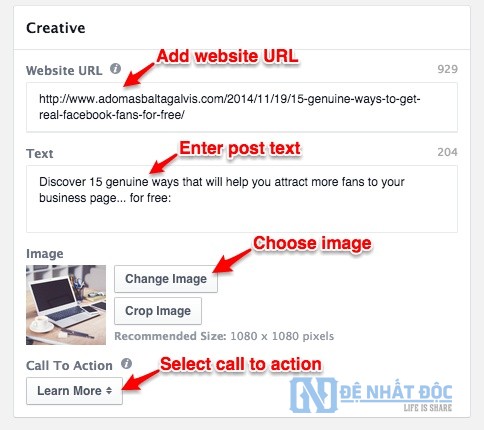 Cuối cùng, chọn mẫu hình ảnh cho quảng cáo của bạn, kích thước chuẩn là 1080x1080px và chọn nút Call-to-action như hình ảnh: